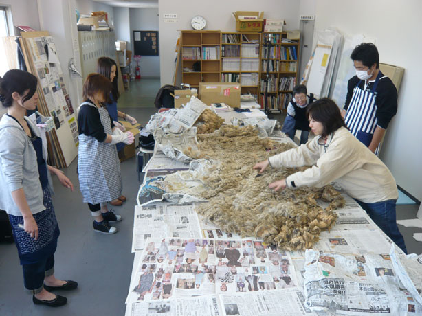 入学したての1年生は羊の毛(以下 羊毛)を広げ、体の部位を確認し、