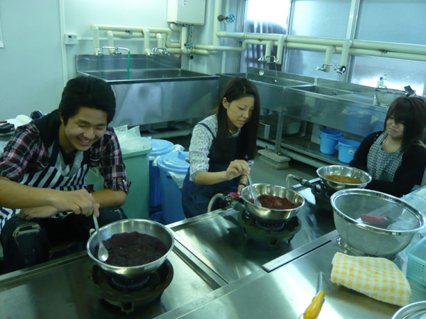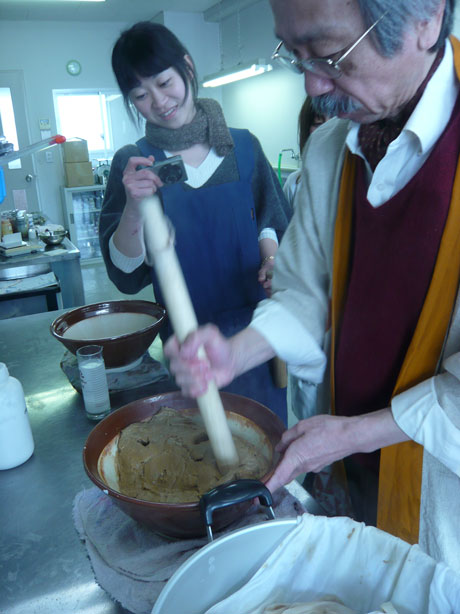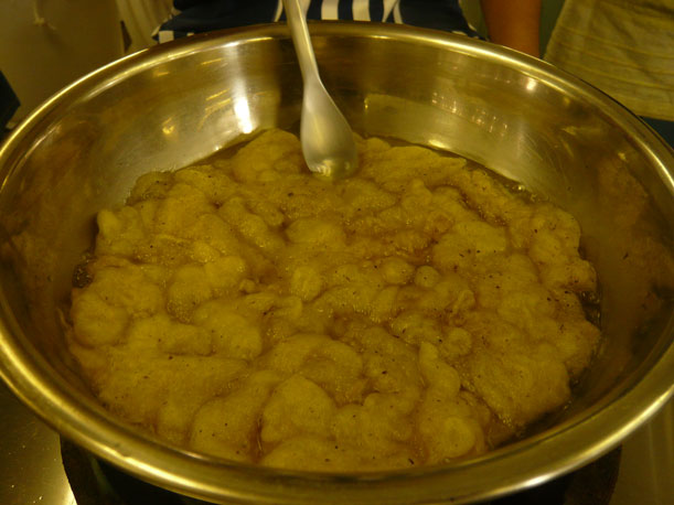 ドーナツ状にしたものを3時間ほど蒸し、すり鉢でよく練る。(石灰水等を入れる)