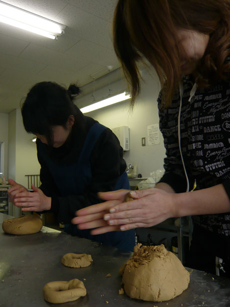 モチ粉+小紋糠+塩にお湯を注ぎよく練って、小さなドーナツを作る。