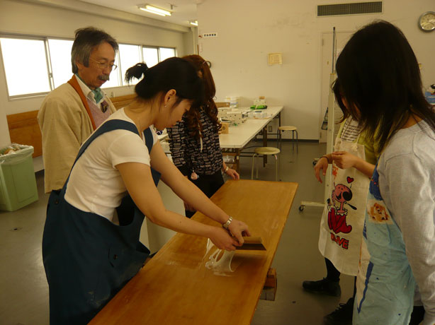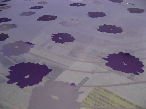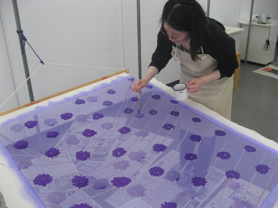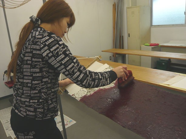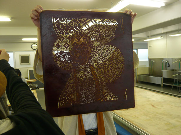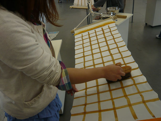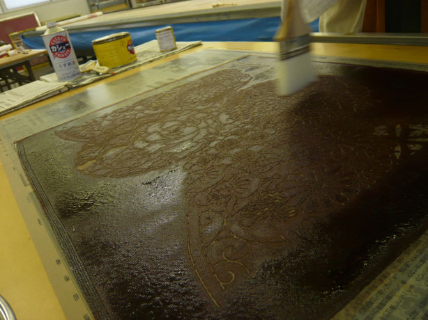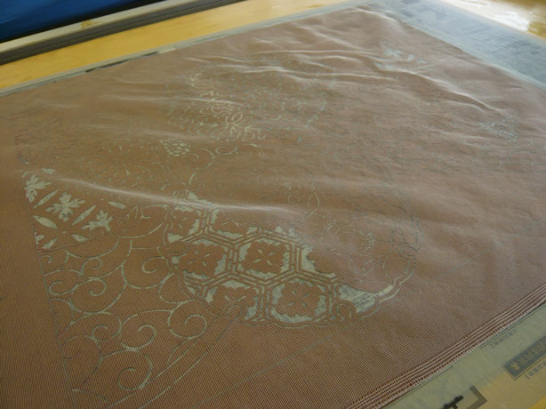 次回は実際に布を板に貼って糊置き(「型付け」)しているところと、色を差す前段階の「地入れ」をお送りします。