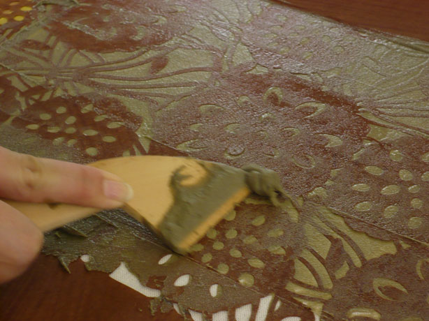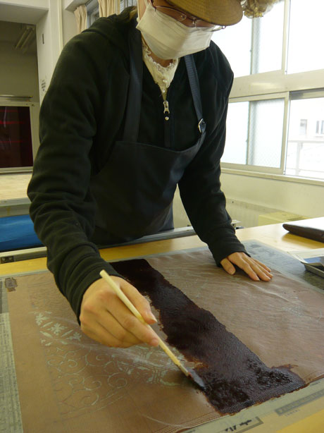 渋紙を生地の上に置き、硬さ調整をした型糊をヘラで置いていきます。