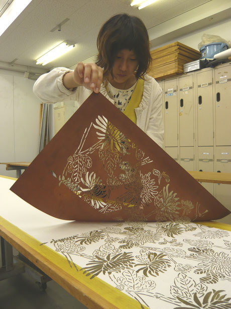 渋紙を図柄通りに彫って、穴のあいた部分に型糊(染まらない部分)を置きます。
