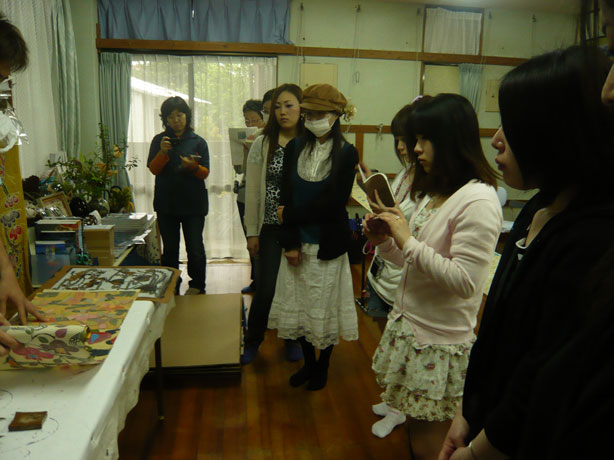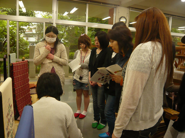 実際にこちらで織られた作品を見ながら技法や施設についてのお話を聞きました。
